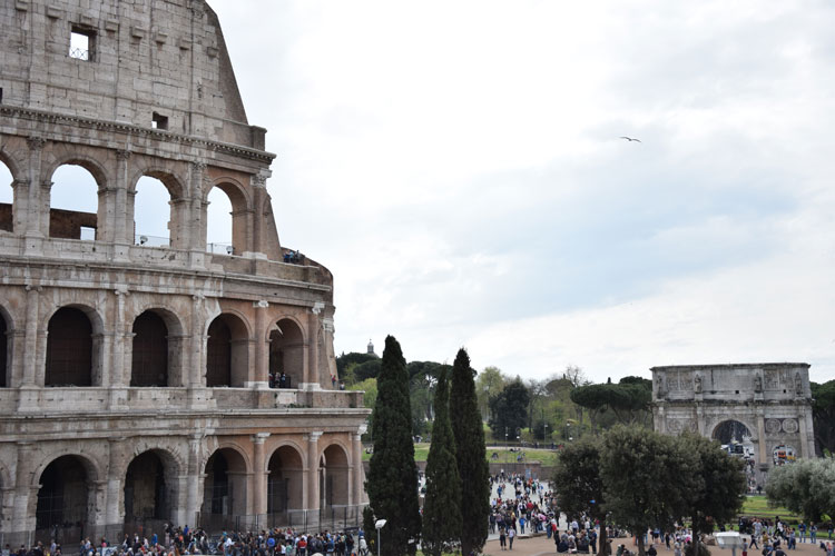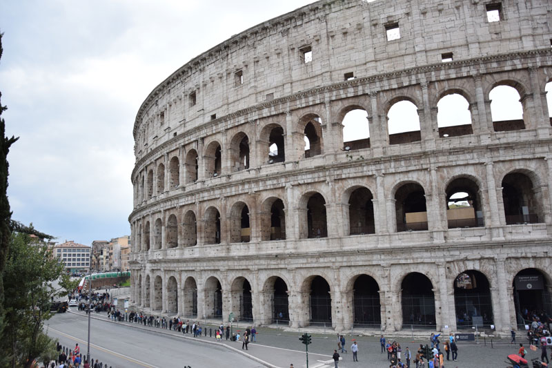 Me voilà donc marchant d’un bon train sur l’avenue principale du centre historique de Rome. Au loin, je vois l’imposante structure du célèbre monument se dessiner petit à petit, c’est un bon point de vus mais malheureusement des grues placées au bord de la route pour rénover le forum Romain juste à côté gâchent la vue.