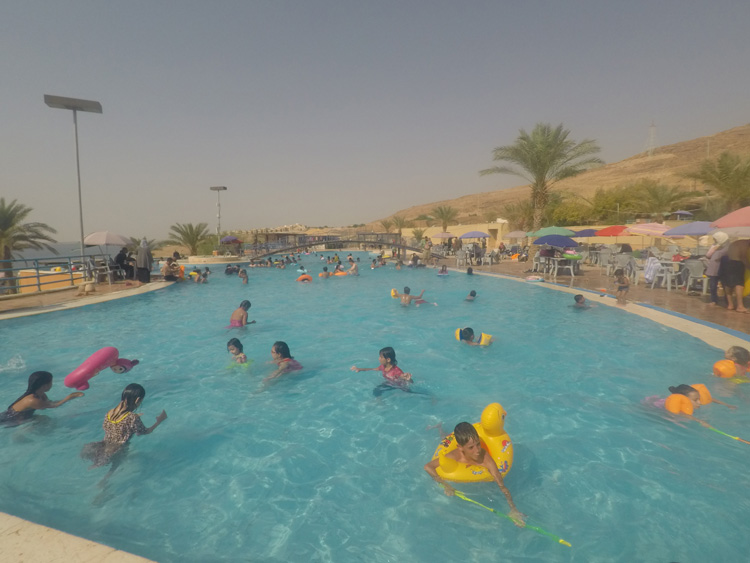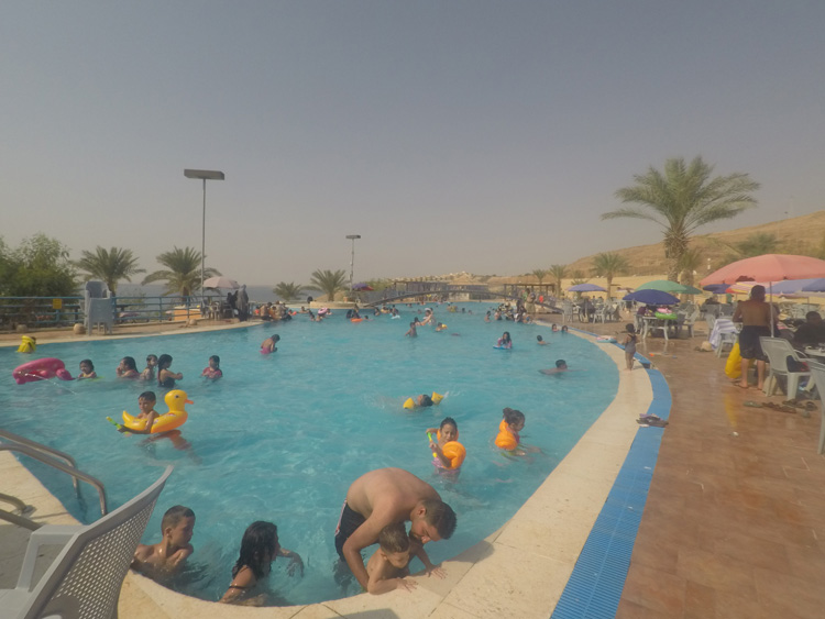 « Alors est ce qu’on flotte si bien que ça ? » Tu me demandes. Ben oui ! C’est hallucinant ! Même en marchant les mollets immergés on se sent légèrement repoussé et une fois allongé dans l’eau, c’est magique. Tu peux même lire un bouquin dans l’eau. L’eau étant trop chaude je n’y reste qu’un quart d’heure, ensuite direction la piscine. C’était super sympa de se baigner avec les Jordaniens. Un peu comme si je partageais leur vie de famille.