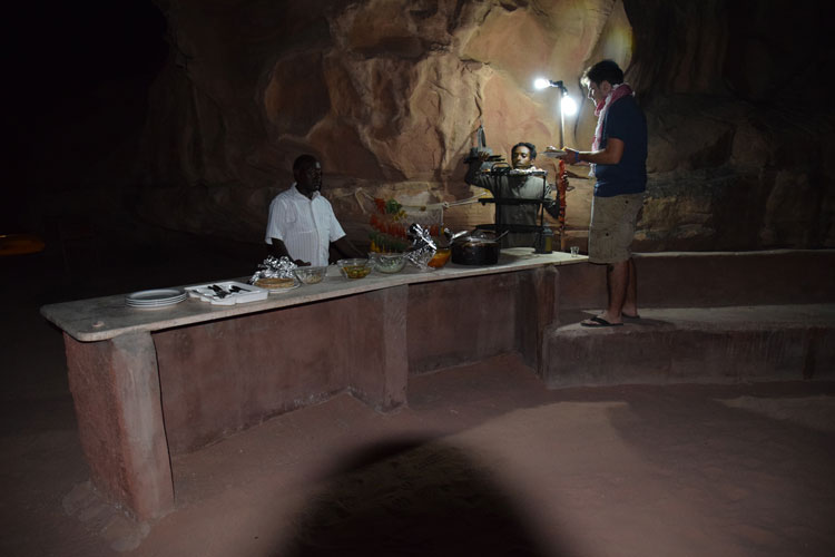 L’heure du repas est arrivée, et le cuisinier du camp nous a gâtés, il y a de tout. Divers salades de légumes, du riz, des pommes de terre, du poulet et des courgettes. De plus, il nous montre aussi comment il fait cuire tout ça. En fait, il y a une marmite enterrée dans le sable, il allume un feu à l’intérieur, puis place ce qu’il veut faire cuire, ferme et recouvre le tout de sable ensuite ça cuit pendant deux heures.