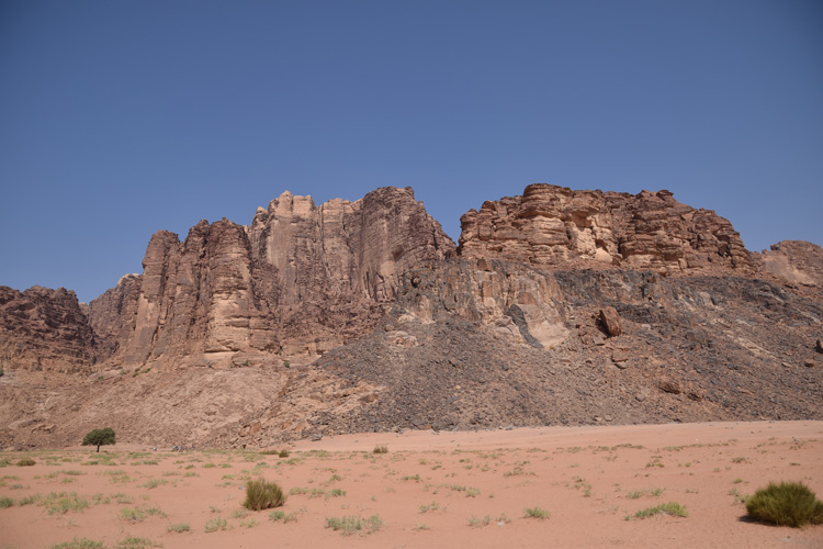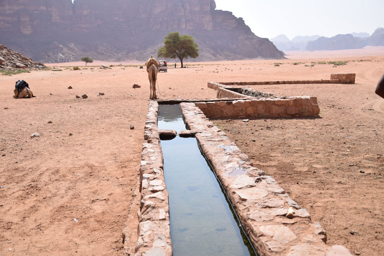 C’est parti, on se dirige vers Lawrence’s spring une source d’eau potable dans le Wadi Rum nommée ainsi par rapport  au film Lawrence d’Arabie. Déjà  sur le chemin le panorama est superbe. Mon destrier est affamé, il mange tout ce qui passe à sa portée. En tout cas, je suis bien content de voir que le guide lui laisse faire sa vie, pas de « je tire sur la corde pour te forcer à avancer ».
