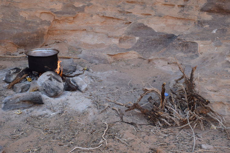 Arrive ensuite l’heure du repas. Nous nous arrêtons à l’ombre du surplomb d’un massif rocheux, puis nous ramassons du bois pour le feu et nous installons le coin pique-nique. C’est Abdoul qui cuisine, au menu: Pain, houmous, thon et un genre de ratatouille avec toute sorte de légumes. C’est un peu trop salé à mon goût mais tant pis, j’ai faim.