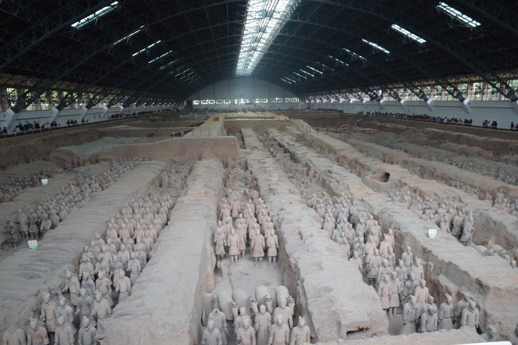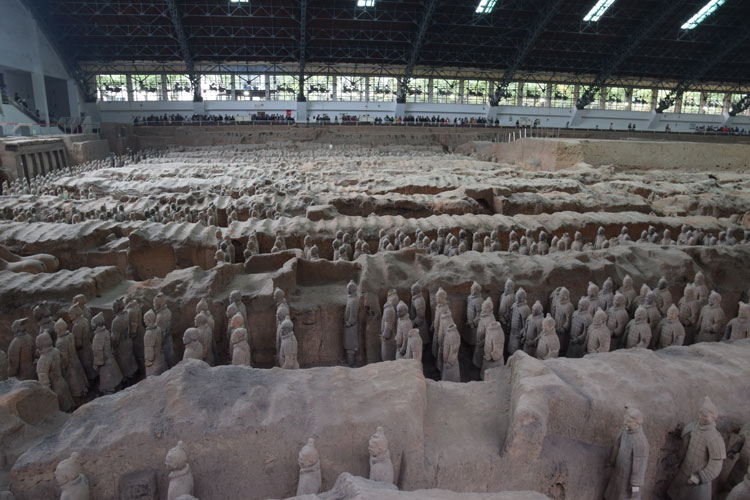 Le gamin étant franchement mégalo, il souhaite que sa dernière demeure soit grandiose et le reflet de sa puissance. On exaucera donc son vœu (pas le choix). Ainsi, on creusera des tranchées tout autour de sa tombe, et on disposera à l’intérieur une armée de soldats en terre cuite recouverte d’un plafond de nattes et de terre. Le chantier dura trente six ans et fit travailler plus de 700 000 personnes. Entre-temps, le roi conquit pas mal de territoires et s’auto proclama premier empereur, comme ça. Tranquille et détendu.