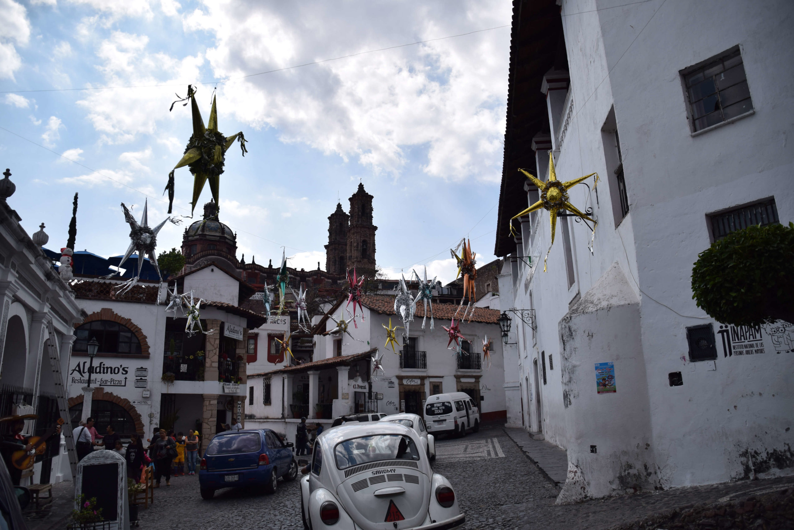 Je me sens ici un peu comme en dehors du temps car l’atmosphère y est particulière. La ville est un labyrinthe d’escaliers et de petites rues qui montent et qui descendent. De plus, les décorations des fêtes sont encore là. Enfin, tous les taxis de Taxco sont de vieilles coccinelles blanches, ce qui ajoute au charme particulier de la ville.