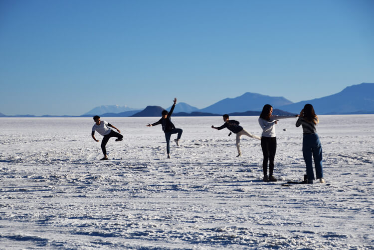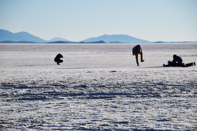 Le lieu est tellement vaste et plat qu’il permet de faire des photos en jouant avec la perspective. En effet, il est possible de faire des photos trompe-l’œil. Notre guide à un dinosaure en plastique avec lui, il s’improvise photographe et nous passons un bon moment à faire la meilleure photo possible.